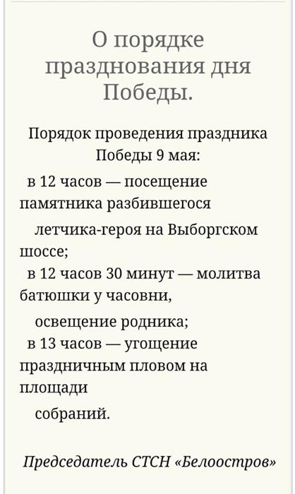 12:00 - на площадке у часовни в СНТ "Белоостров" на 41 км служба отца Сергия, праздничный концерт, музыка, ансамбли, книжные и продуктовые лавки, солдатская каша и фронтовые 100 грамм