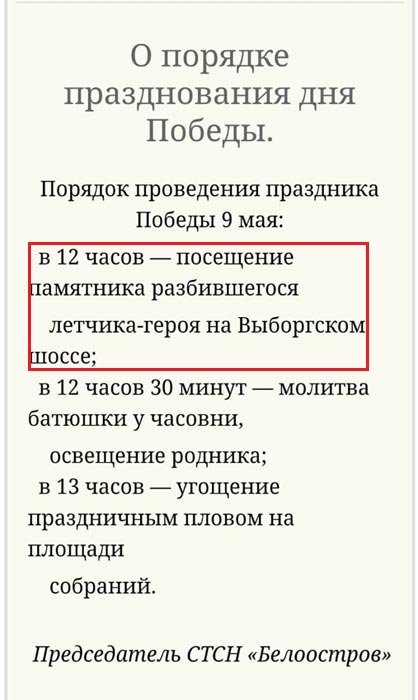 Там же есть подпись: председатель СТСН "Белоостров"