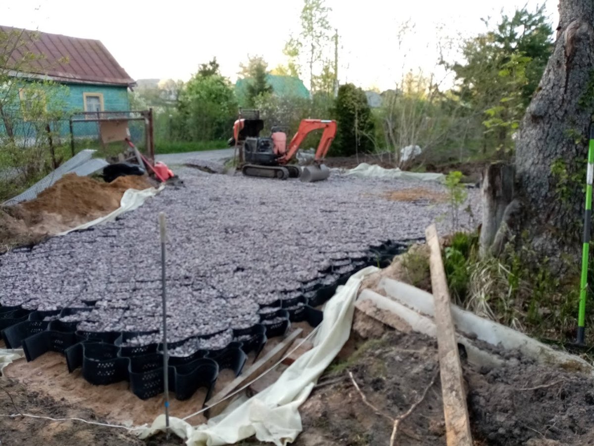 Парковка на несколько автомобилей, пешеходные дорожки с использованием объемной георешетки.