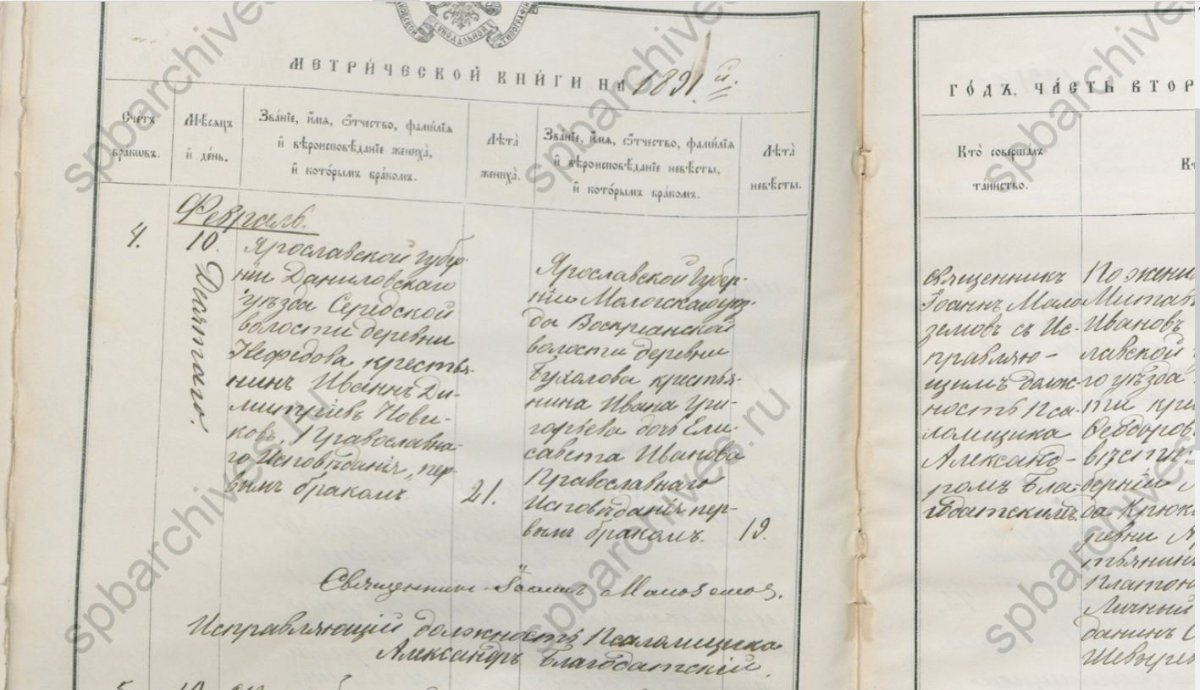 Интересующий вас документ находится в ЦГИА СПб фонд 19, опись 127, дело 80. Номер листа не знаю, но там все очень хорошо находится, скана на весь разворот у меня нет,прилагаю то что есть, по невесте и жениху там все видно. По жениху это Иван Дмитриевич Новиков, родился в 1869 году, был крещен в Троицкой "Кайдановской" церкови в Белоострове. Он был племянником моего прадеда.