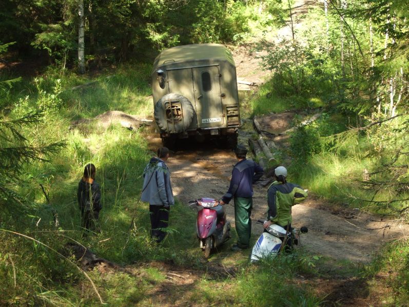 Что можно сказать. Во-первых, она приводит в точку слияния с дорогой на Лампиярви, которая всем известна. Это дорога через бывший разрушенный мостик у газопровода на первой танковой и потом все левее и левее. Точка 5 это то мерзопакостное болотце с черной водой недалеко от Лампиярви. Там встретились четыре человека на двух мокиках, которые ехали от Лампиярви. На вопрос - как там дорога, они показали штаны, забрызганные до подмышек и сказали, что там везде так. Это болотце они, кстати, преодолевали сходу, не слезая с мокиков. Правда, не посередине лужи, а по кромке. И тут показался ОН! Это был Газ-66 с кунгом, с пропуском МЧС, с лебедкой и вообще. Ехал он как раз по той дороге, которую описываю. Тут он с нее сворачивает, хреначит, ломая елки и перемахивая окопы. Ну не хватало ему места, чтобы хорошо вписаться в левый поворот к Лампиярви. Потом не напрягаясь проехал черную грязную жижу и скрылся за деревьями. Вот что надо брать! А то все – Лендкрузер… Лендровер… Ниссан Патрол там всякий…