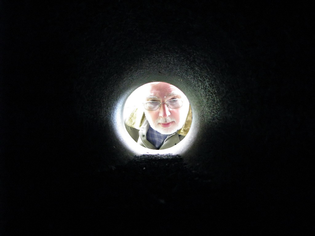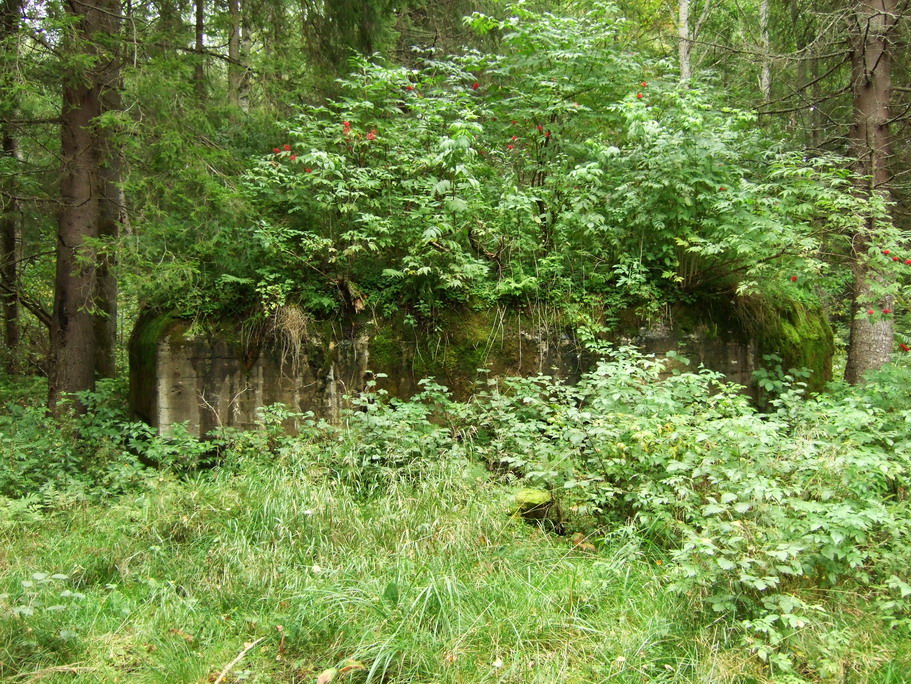 Второй дот в густой растительности. Буквально метрах в тридцати и обнаружился. Очень интересная конструкция. Три пулеметных и одна наблюдательная амбразура. В доте, включая противоштурмовую решетку, девять! дверей. Девять помещений. ФВУ в нормальном состоянии, чуть поржавела. Была водяная колонка. Вроде, была какая-то электрическая машина – сохранился фундамент и шпильки. Большие металлические шкафы. В них обнаружились коробка из-под чая Ахмад, бутылка из-под виски, пустые консервные банки. Кто-то заботливо подвесил полочки. На них вперемешку с вешалками что-то лежит, завернутое в старое одеяло. Надо было вообще-то проверить. Вдруг контрабандный товар?