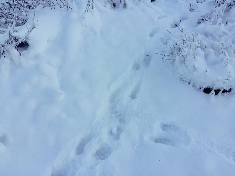 На участках много звериных следов. В основном, конечно, собачьих (они даже постоянные тропы себе протоптали), но встречал и заячьи, кажись.